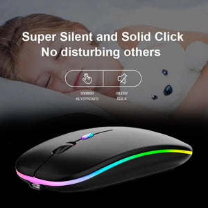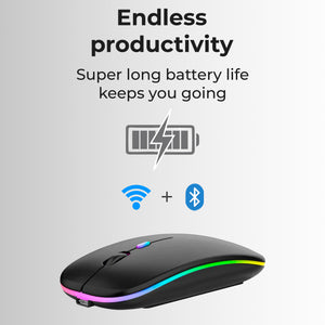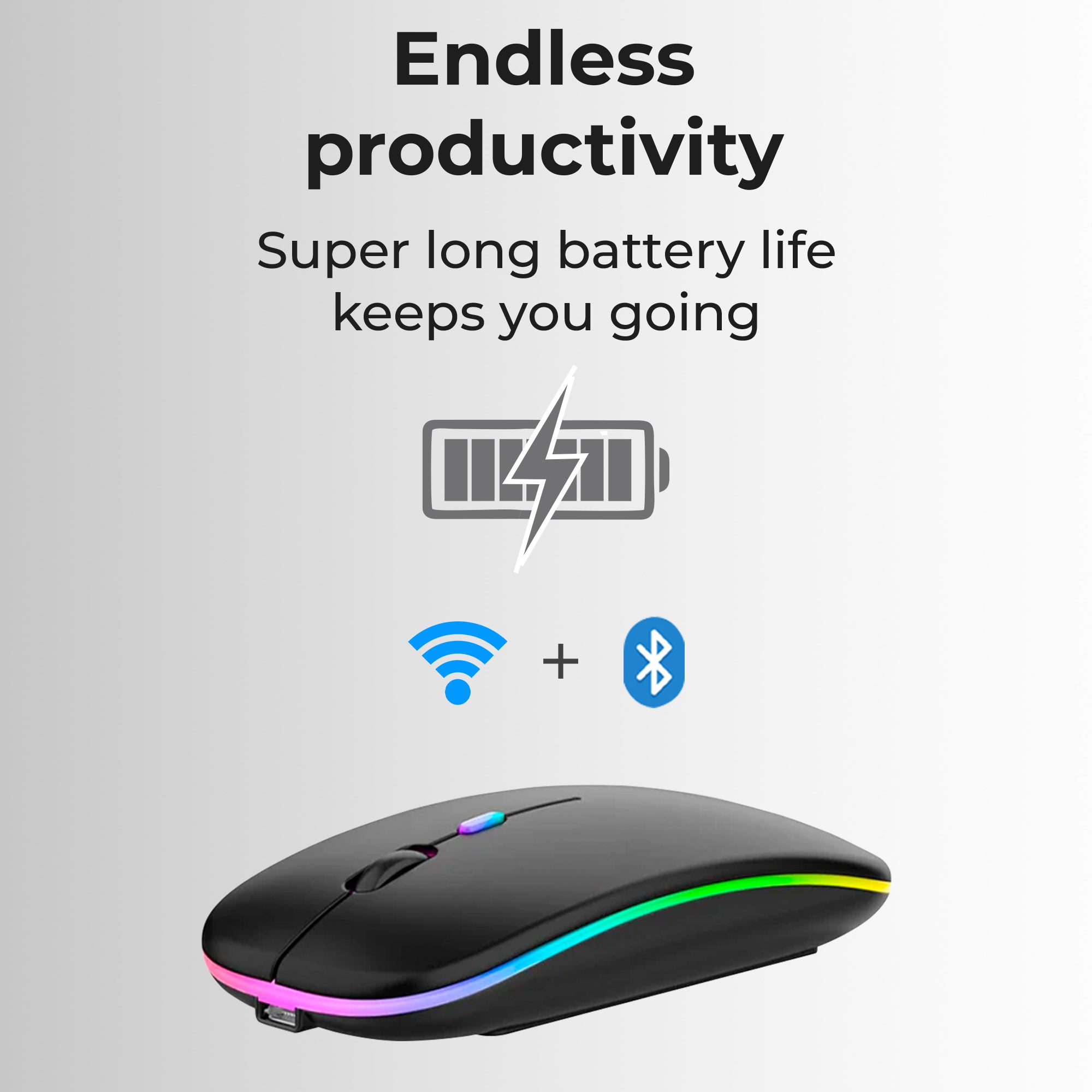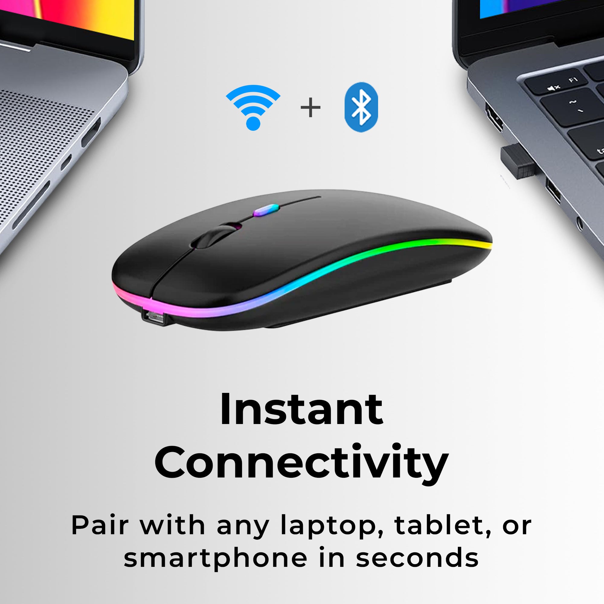 Glassology 2.4GHz Wireless + Bluetooth Mouse, Multi-Device Dual Mode Slim Rechargeable Silent Click Buttons Wireless BT Mouse, Adjustable DPI 800-1200-1600, Multicolor LED Lights, Auto Sleep Black