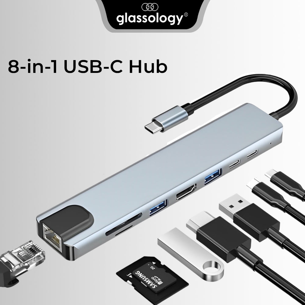 Glassology 8 in 1 USB C Hub (2 USB 3.0 SD & TF PD 1000Mbps Cable VGA & HDMI) Grey